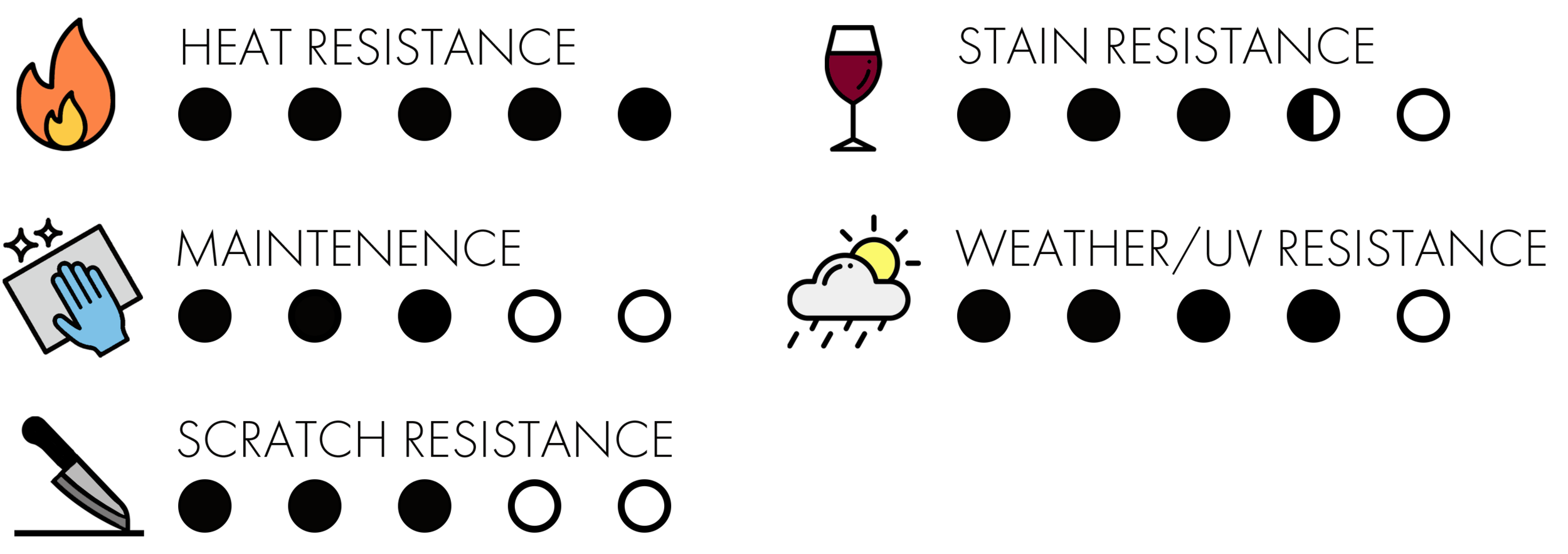 WEATHER/UV RESISTANCE: Granite is a great option for outdoor applications. Being exposed to the elements, it is likely that signs of wear & tear will appear faster. It is important to keep up with a sealer to prevent your countertop from absorbing moisture. It is recommended that you keep a cover over your outdoor countertop while not in use, and a shelter structure over your countertop is ideal. And remember, stone can get very hot when in the sun all day (especially dark colors), so it helps to offer it some shade with an umbrella or other coverage.